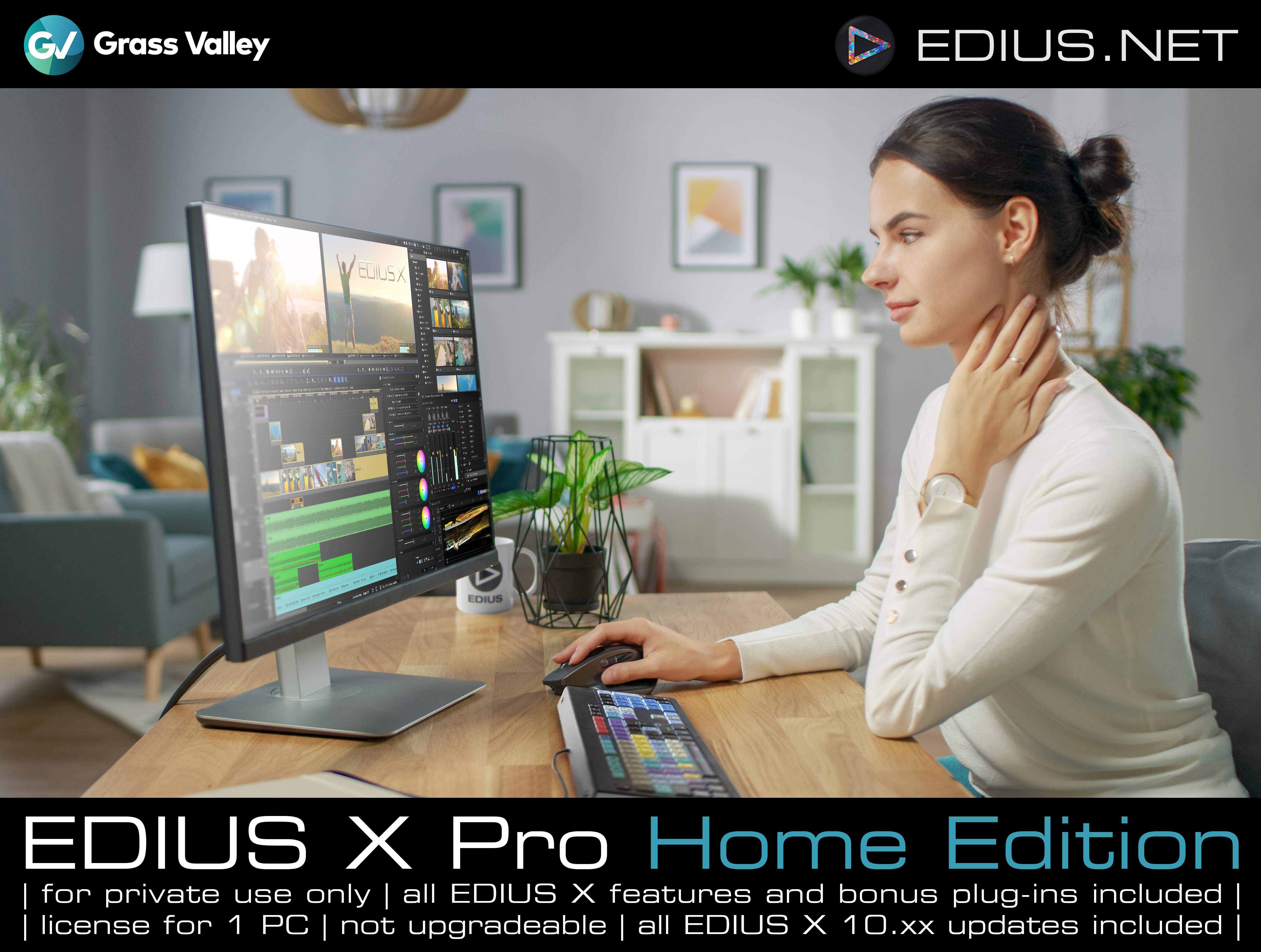 The EDIUS X Pro Home Edition offers the full functionality and all features of the regular full version including the bonus plug-ins from Acon, ProDAD and NewBlue for optimizing audio, title creation and video effects. Furthermore, all coming EDIUS X 10.xx updates are included.
