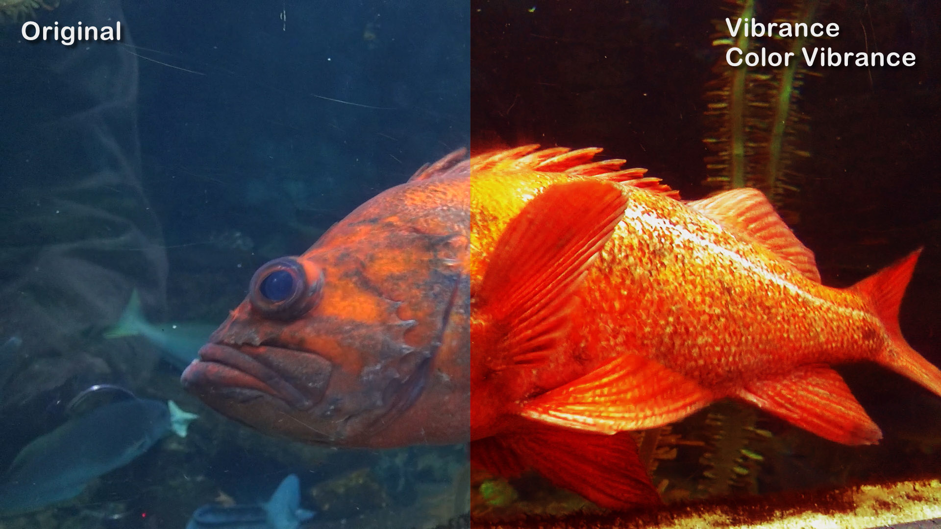 Color-Vibrance: if you shoot under water or against backlight your images may appear flat. The „Color-Vibrance-Filter“ restores contrast und color and brings back life into your pictures without introducing artefacts. You determine the intensity and keep full control over your image. This also works great to add color to greyscale, procedural effects such as particles and textures. In this example we combined the filters „Vibrance“ and „Color-Vibrance“.