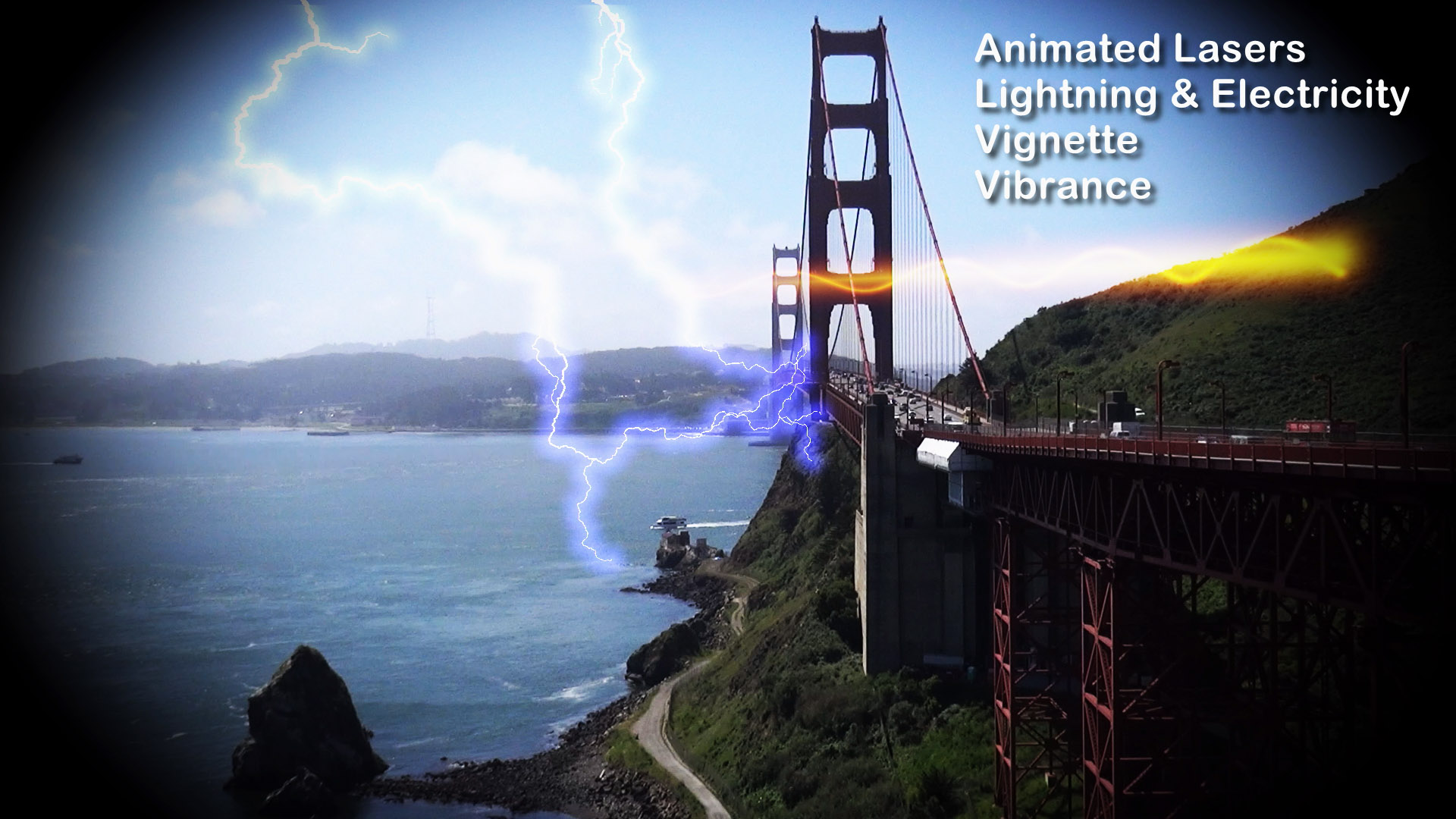 Animation/Compositing: For complex compositings you usually apply specialized solution like HitFilm. But maybe your scene just requires a few animated objects like flashes or laser beams? We have setup both in this compositing of the Golden Gate Bridge. You will be amazed how quickly and easily this can be done. A vignette, customizable in nearly every aspect as well, rounds up the composition.