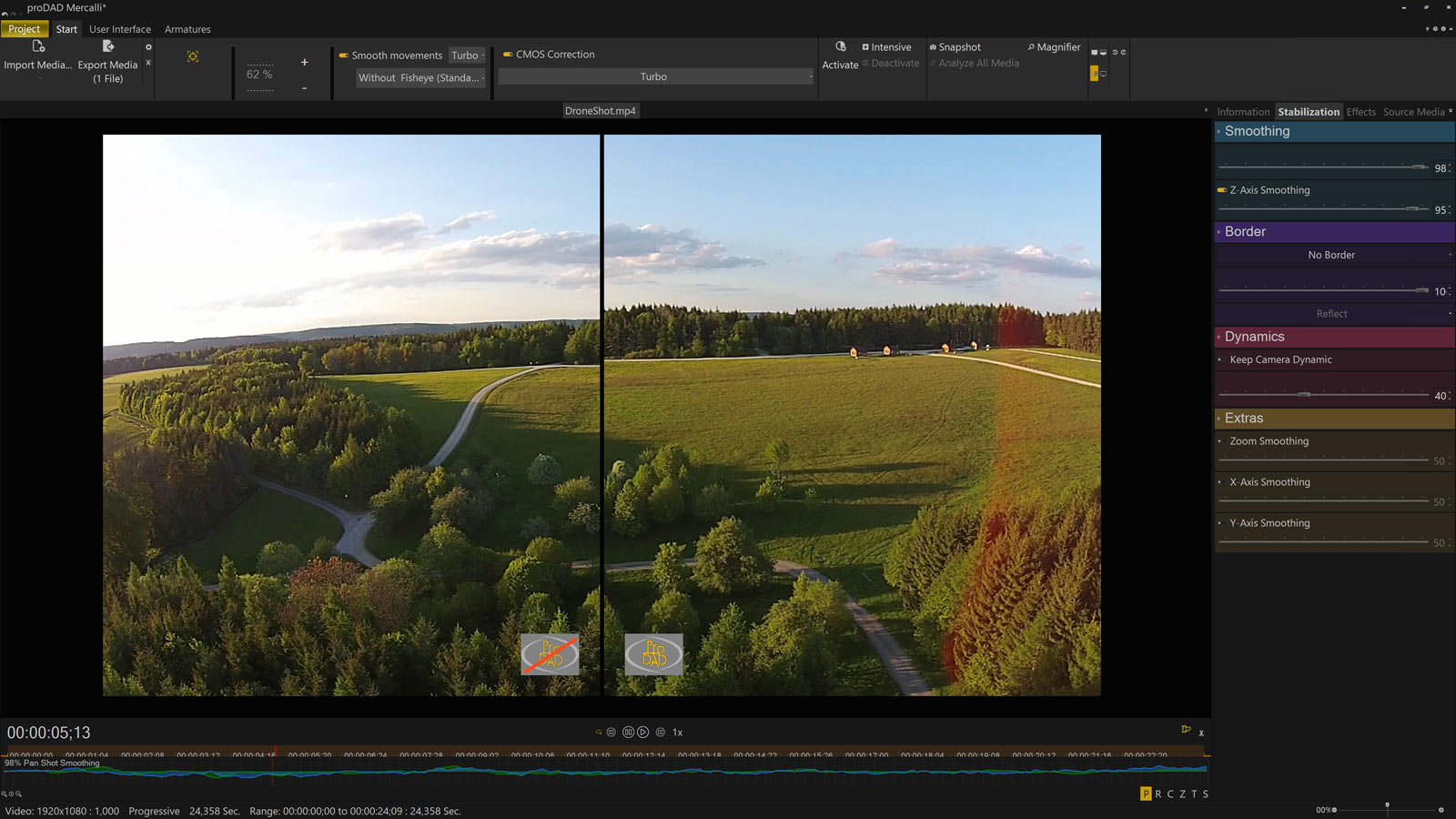 Stabilize – with Mercalli V6 (CMOS Only) to MP4: Mercalli features a highly effective rolling shutter correction that functions without requiring a zoom into the image. This is ideal for recordings distorted by the "wobble effect" that require specific CMOS correction rather than comprehensive stabilization.
