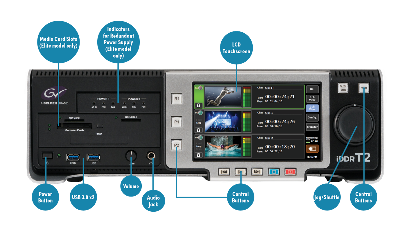 Featuring rear-panel video/audio/remote/LTC connectivity, T2 4K can also accept files via USB 3.0, or by data transfer over a standard Gigabit Ethernet network, including Grass Valley HQX, XAVC, XAVC S, XDCAM, P2, AVC-ULTRA, Apple ProRes 422, Avid DNxHR, Avid DNxHD and MPEG-2 files.
